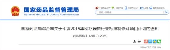 3月20日,國家藥品監督管理局發布《關于印發2019年醫療器械行業標準制修訂項目計劃的通知》(藥監綜械[2019]23號)。