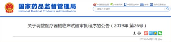 4月1日,國家藥品監督管理局發布《關于調整醫療器械臨床試驗審批程序的公告》,表示對醫療器械臨床試驗審批作出調整,進一步優化臨床試驗審批程序。