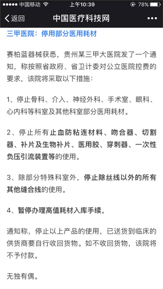 近期,網上一張截圖再一次引爆了醫療圈的“雷”,四川、貴州、山東等省份要求停用部分醫用耗材。可以看到包括吻合器、切割器、補片等耗材被禁止使用,手術縫合要求使用絲線,讓行內人士不無諷刺說,得了啥病別想著做手術了,吃點中藥、做個理療沒準就能好了!
