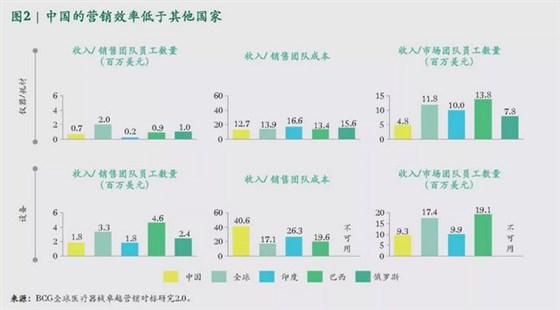 另一方面,我國(guó)營(yíng)銷(xiāo)效率低的現(xiàn)狀也急需改變。根據(jù)BCG數(shù)據(jù)顯示,中國(guó)醫(yī)療儀器/耗材的營(yíng)銷(xiāo)效率低于全球平均水平,甚至低于市場(chǎng)也在不斷增長(zhǎng)但成熟度更低的其他金磚國(guó)家,尤其是印度。