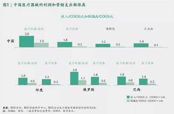 根據(jù)BCG2015年的數(shù)據(jù),中國(guó)醫(yī)療儀器/耗材公司的平均銷(xiāo)售、綜合和管理費(fèi)用(SG&A,主要為營(yíng)銷(xiāo)支出,以銷(xiāo)貨成本的百分比計(jì))超過(guò)典型工業(yè)品公司的15倍。雖然醫(yī)療器械行業(yè)正面臨價(jià)格下行的壓力和采購(gòu)流程急劇變化的威脅,但各項(xiàng)成本卻是居高不下。