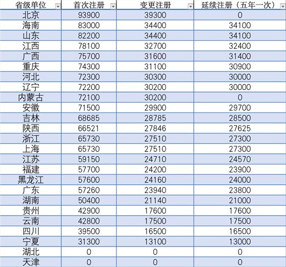 免收注冊(cè)費(fèi)的省級(jí)單位有天津和湖北,內(nèi)蒙古自治區(qū)在延續(xù)注冊(cè)上也免收。