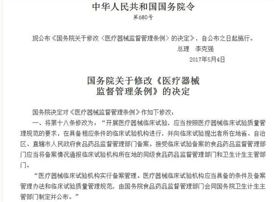 2017年5月4日國務(wù)院公布了最新《醫(yī)療器械監(jiān)督管理?xiàng)l例》,相較之前條例,主要做了四大調(diào)整