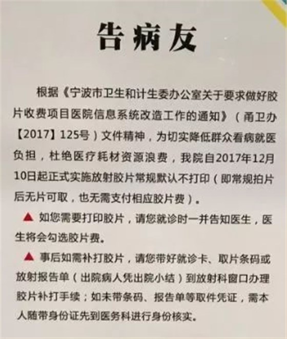 在此之前,浙江省寧波市北侖區(qū)人民醫(yī)就發(fā)布一則通知,核心內(nèi)容就一個:從2017年12月10日開始醫(yī)用膠片不再默認打印,病人也無需支付相應(yīng)費用,如果外院會診或者涉及到第三方賠付需要膠片的自行到相關(guān)窗口繳費并補打。